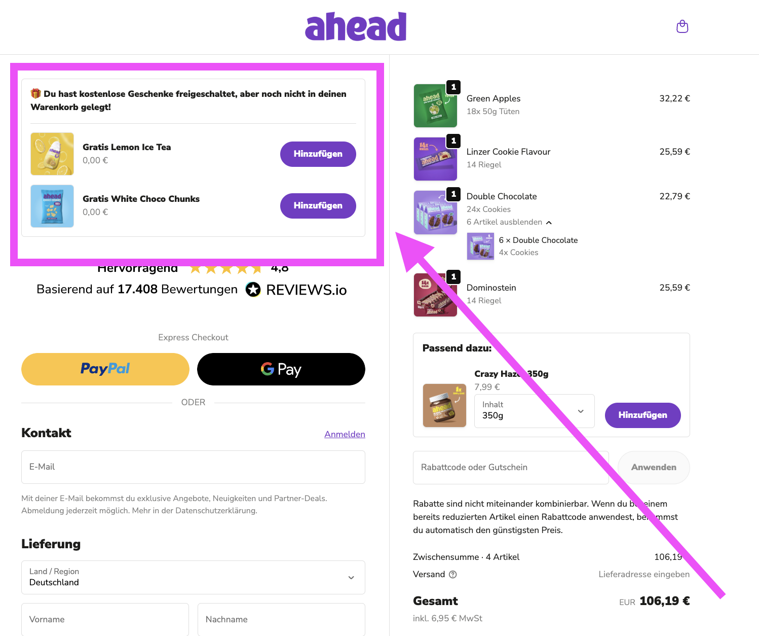 👉 Achte also darauf, dass du nach Abzug des Rabatts noch über dem Mindestbetrag liegst, wenn du Geschenke haben möchtest.Geschenke in der Bestellbestätigung 📦